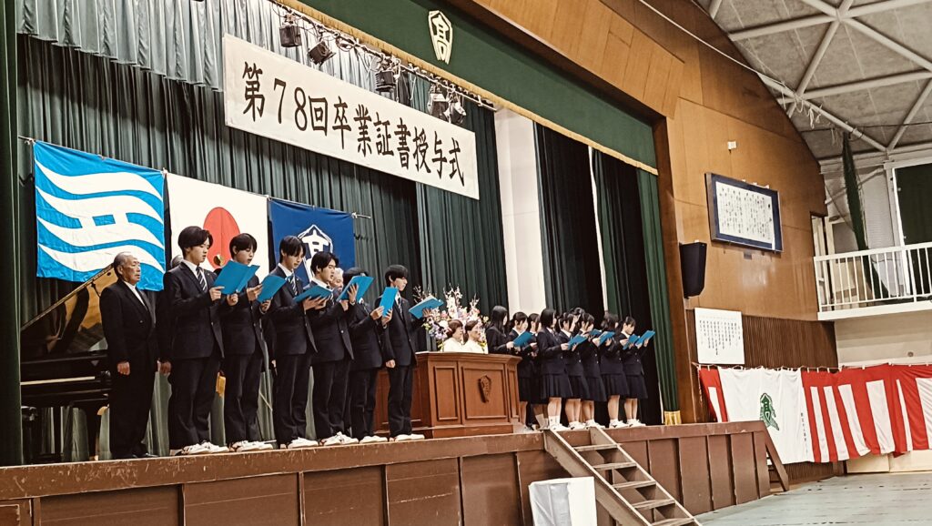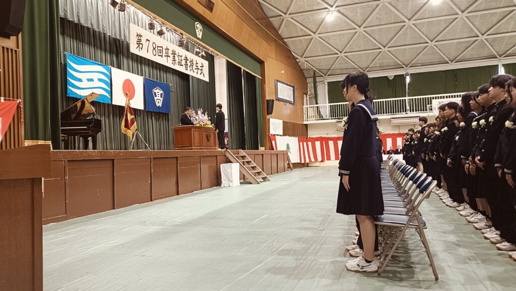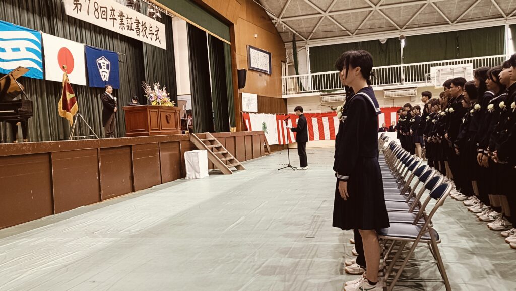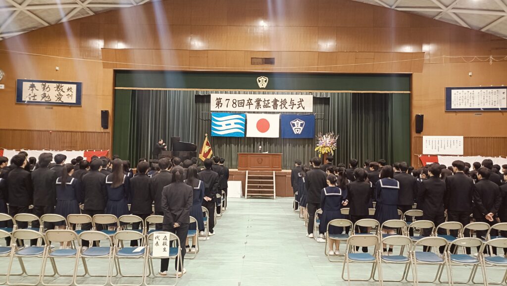 高砂高校恒例の生徒会と保存会の皆様とによる、謡曲高砂に始まり、厳粛なる雰囲気で卒業式が始まりました。