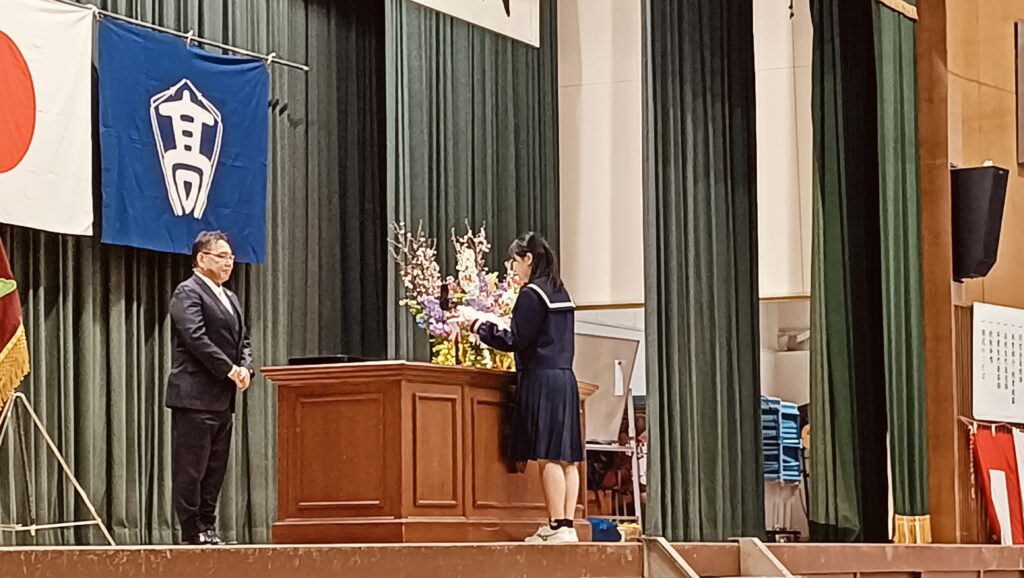 記念品贈呈式ではPTAからは証書ファイルとギフトカード、同窓会と生徒会からタンブラーを卒業生への記念品としておくられました。また、卒業生から学校へは遮光カーテンをいただきました。