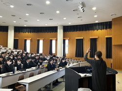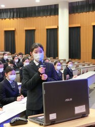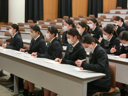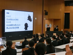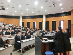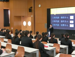 各学年より2学期の振返りの発表がありました。2学期は体育大会・龍北祭という大きな学校行事があり、クラスで力を合わせて思いきり楽しみました。一方、各学年で看護科の現地実習がありましたが、気持ちを切り替えて準備することが不十分だった人もおり、オンとオフのけじめをつけることの大切さを学んだ学期でもありました。普通科とは異なる看護科の日常に戸惑うこともあると思いますが、先輩・後輩との交流を通して、色々な情報を得て一つ一つ丁寧に取り組み、看護師免許取得という大きな目標に向かって努力を重ねていきましょう。