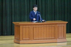校長式辞では、2学期とこの1年の振り返りを行い、来年どのような年にしたいかを考えるよう話がありました。また「自分で考えること」について、「メタ認知」の考え方が重要であると話されました。授業を聞きながらノートに書きとめることもメタ認知の1つであり、どの部分が重要か自分の頭で考えることはメタ認知を高めることにつながります。また、自分の失敗やマイナスの感情を分析することや心を無にする時間を持つことで、自分の感情に振り回されることが減り、他者の気持ちが考えられるようになると話されました。