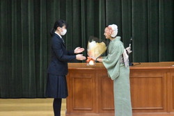 1年4か月間、ALTとして勤務されたスーザン先生から「学校を卒業しても学びは終わらないこと」「知識が増えれば、恐れは少なくなること」「成長において失敗はつきものであり、失敗を恐れないこと」という生徒のこれからの人生において糧となることを実体験を交え教えてくださいました。生徒代表から花束を渡し、全校生徒は花道をつくり、温かな拍手で見送りました。
