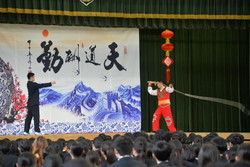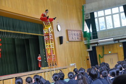 次に行われた「鞭芸」では、生徒が手に持った新聞紙を鞭で切り裂くという内容でした。一瞬の油断も許されない緊張感に包まれ、鋭い音の後に半分になった新聞紙を見た瞬間、体育館が歓声に包まれました。また、3名の生徒が「空竹(中国コマ)」を体験しました。天井近くまで上がる中国コマを見て、簡単そうに見えましたが、実際は中国コマを回すことも難しく、技術の高さに圧倒されました。