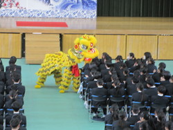中国獅子舞の登場で始まり、獅子が生きているかのように軽やかに体育館内を跳ね回り、愛嬌のあるその姿に、会場全員が釘づけになりました。