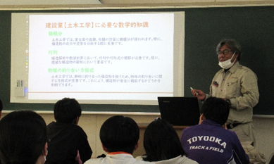 建設業に必要な数学的知識は、微積分や行列、物理学など未習分野が多く、そのうえで大学では構造力学や水理学、地盤工学など専門知識が必要なことを知りました。携わる仕事上の計算は機械に任されるとはいえ、使う人にその理解と基礎知識がなければ何を計算しているか分からず、計算ミスなどがあった時に気付きにくくなるといわれた時には、今の高校での学習と重ねて十分納得できました。数学は公式に入れると何らかの数字が出てきますが、公式の意味と使い方、その理解がないと何をやっているか分からず、間違えても分からず、果ては使えなくなります。数学の解は違っても生活に支障は出ませんが、土木工事の数字は安全性から覆るので間違いが決して許されず厳しいものであることも容易に想像でき、基本が大切だというお話の深さを感じました。