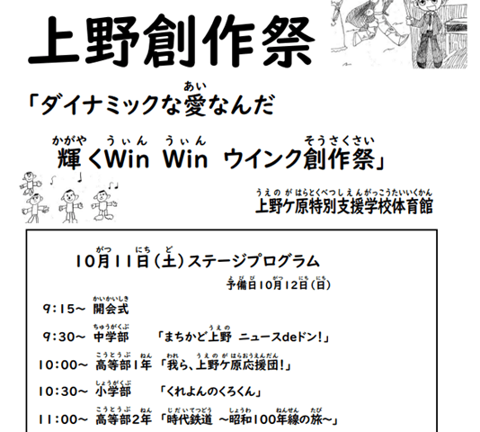 10月11日(土)に上野創作祭を開催いたします。 児童生徒たちが日ごろの学びや取り組みを発表する貴重な機会です。 卒業生や地域の皆様も、ぜひご来校ください。 ※外部の方は受付を済ませ、校内ではゲスト用バッジの着用をお願い