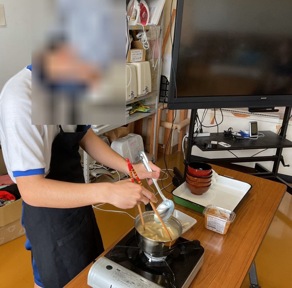 高等部2年の家庭Aグループでは4月から味噌汁の学習をしています。味噌汁は、和食の基本。時間をかけて、出汁について学習しました。出汁をとる手順の中で、煮干しの下処理として「あたま」と「はらわた」をとったり、煮干しからとった出汁の香りを感じたりしました。農園でとれたネギと自分たちで切ったうす揚げを入れ、味噌を溶いて完成させました。