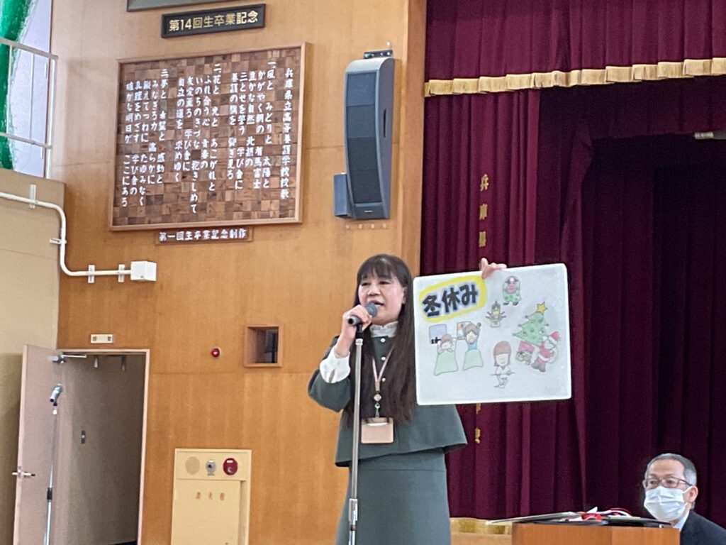 12月24日(水)に、終業式が行われました。校長先生より、「2学期は、創作祭や修学旅行など大きな行事があり、それぞれがんばりましたね。また、冬休みは、規則正しい生活を送り、お手伝いも頑張って楽しく過ごしましょう。」とお話がありました。