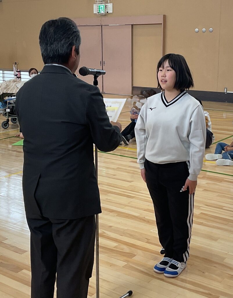 生徒指導部 学校行事 4月13日<対面式・児童生徒会認証式> 2026年4月15日 admin 新入生・転入生を迎える対面式と新しい児童生徒会役員の認証式をしました。初めての司会進行は、緊張した様子でありましたが、最後まで頑張る姿が見られました。校長先生から任命書を笑顔で受け取りました。