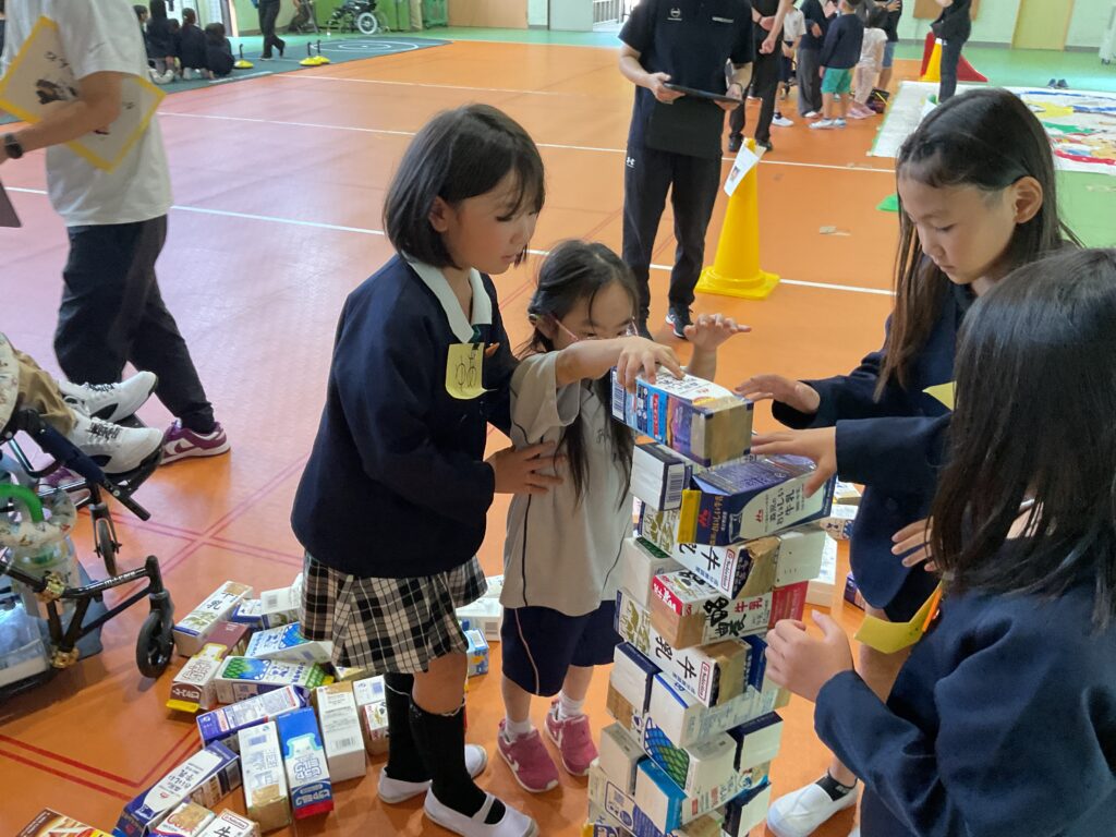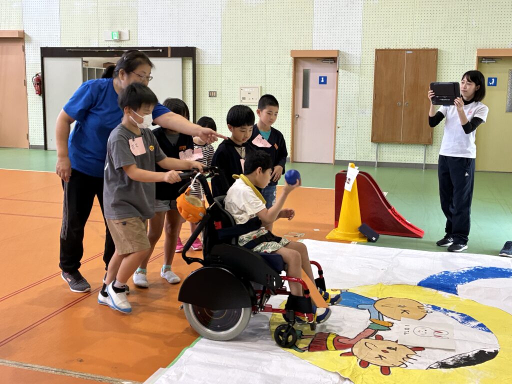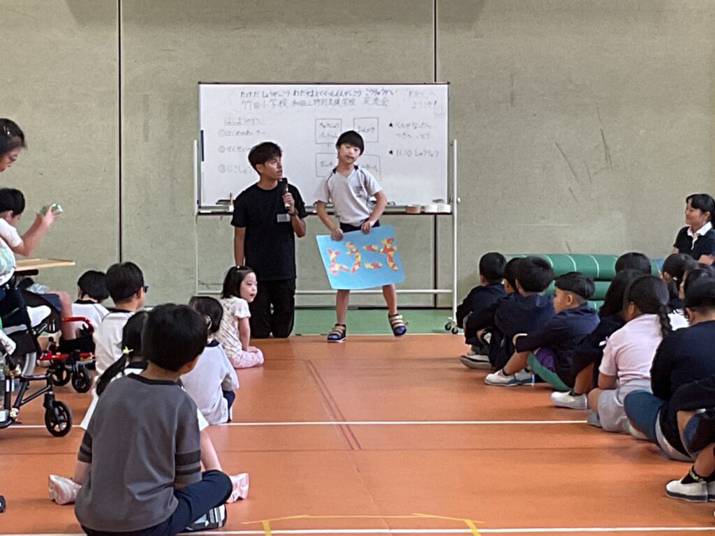 10月10日(金)、竹田小学校3年生を招いて、本校小学部と交流および共同学習会を行いました。順番に自己紹介をした後、ボッチャ、ユニカール、牛乳パック積み、自由に絵を描くことを通して、子ども同士が仲良くなることができました。