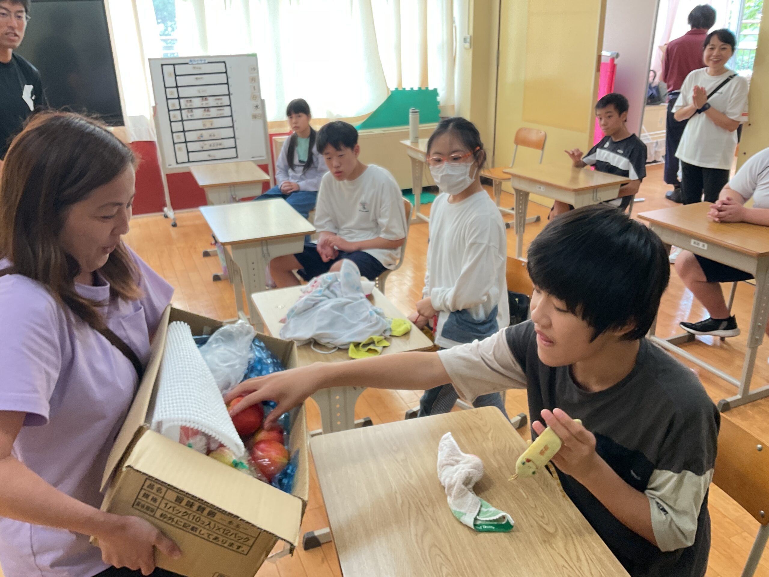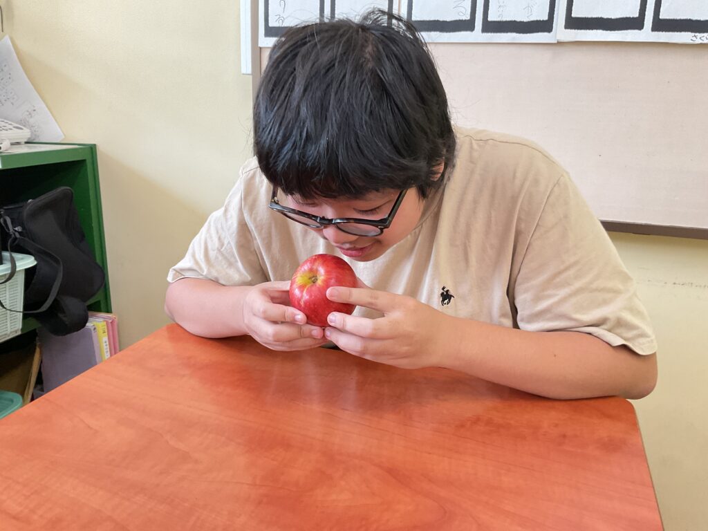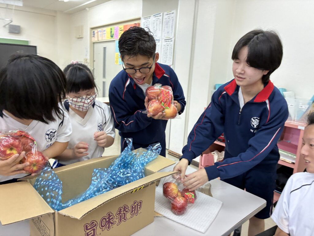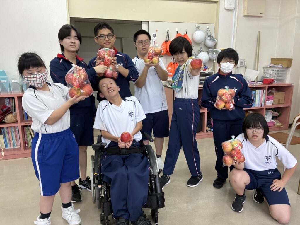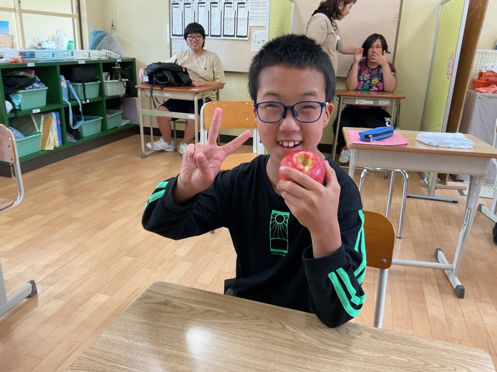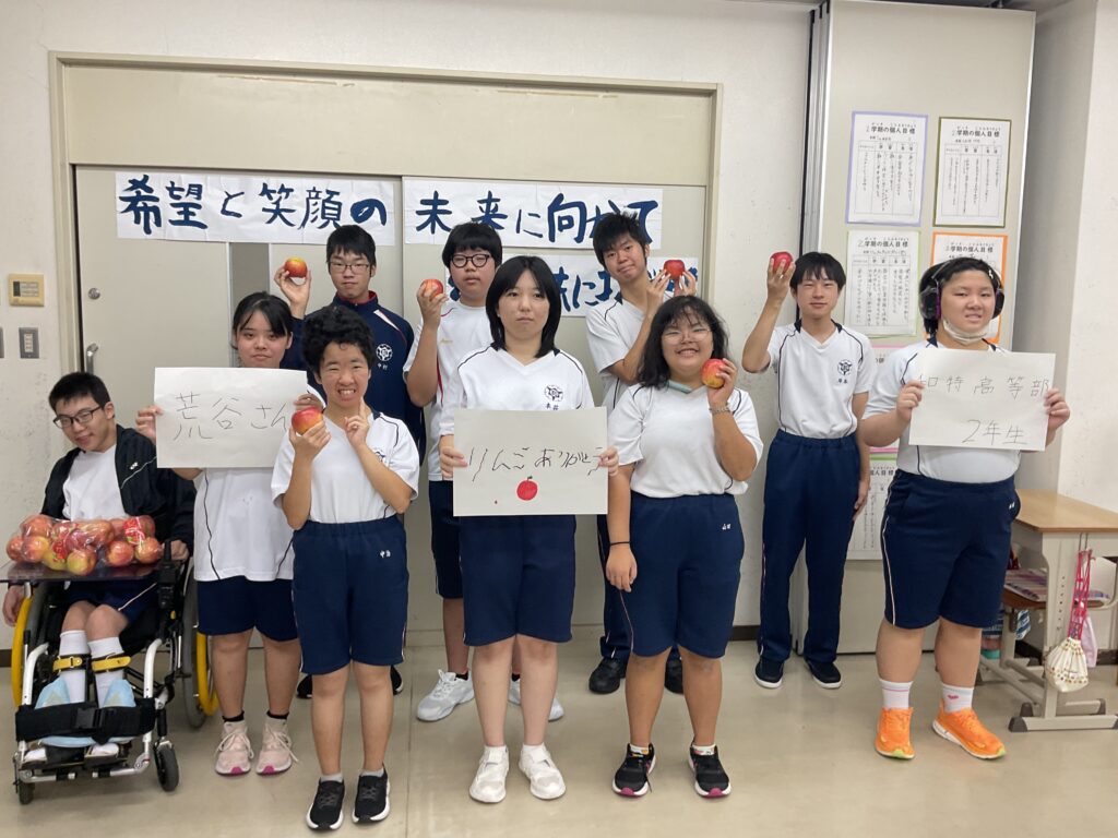 りんごが届いた次の日に、高等部3年生の生徒に箱を開けてもらいました。丁寧に貼られたガムテープを頑張ってはがしたら、段ボールの中から、箱いっぱいのリンゴが出てきました。生徒たちは、「わぁ~!」「すごい」と歓声を上げてしまいました。りんごは10月2日の給食でいただきました。とても甘くて、子どもたちはおいしそうに食べていました。