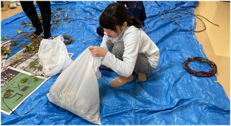 3年生が修学旅行中のため、今日は、1、2年生で学習をしました。自分たちが育てたサツマイモの蔓の葉を一つずつちぎってリースを作りました。長い蔓には、たくさんの葉っぱがついていました。ポキッとすぐに取れる葉や中々取りにくい葉もありましたが、生徒たちは全てちぎり取ることができました。蔓を輪にしてまとめて、乾燥させて出来上がりを待つのみです。どんなリースになるでしょうか。活動後には、片付けもきちんとできました。