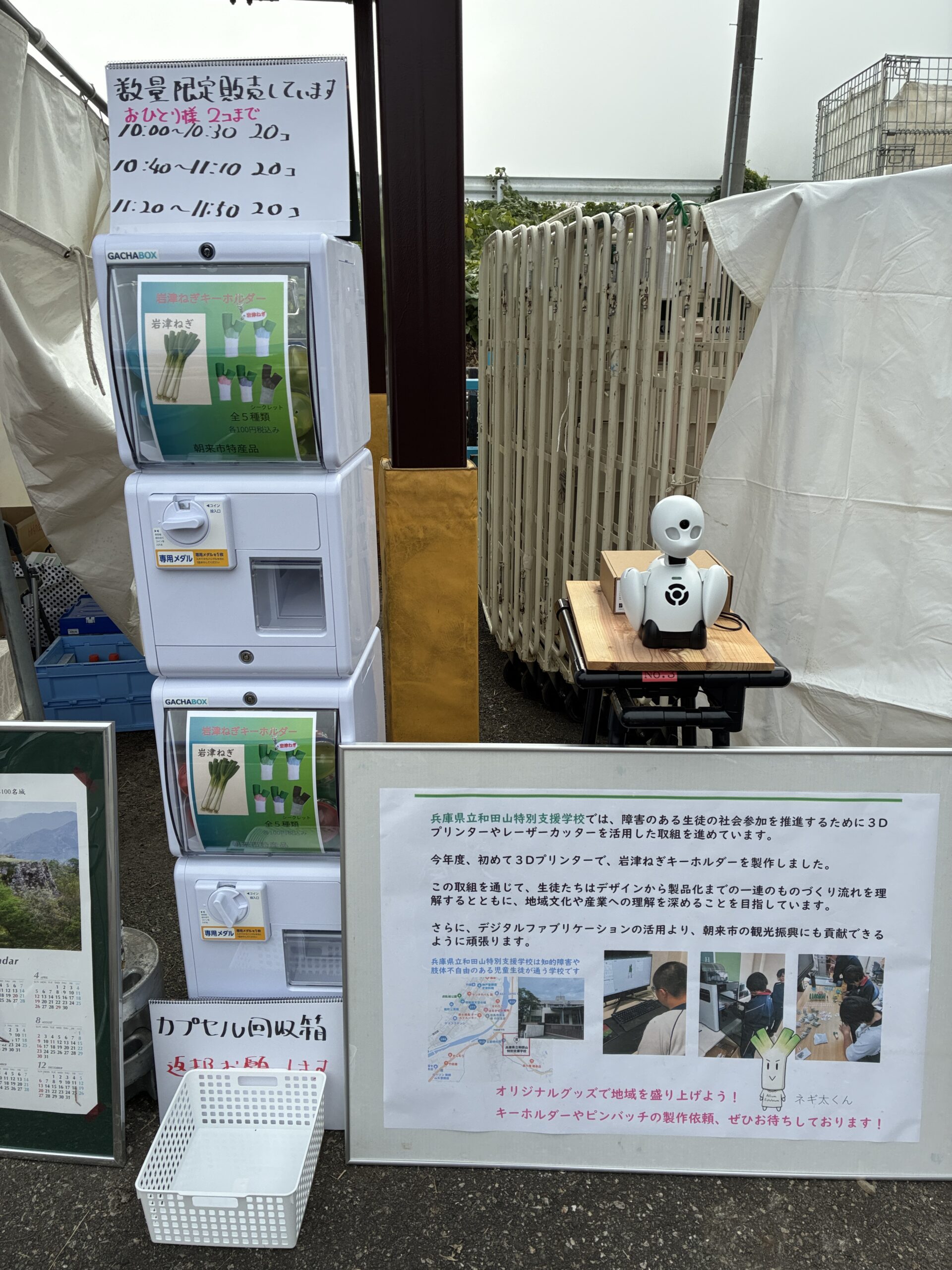 作業学習で製作した『岩津ねぎキーホルダー』を販売しました。高等部3年生の生徒が3名、自宅から販売の接客を行いました。にぎわいのある会場でしたが、OriHimeを通してしっかりとした声を出し、お客さんに気づいてもらえました。OriHimeでの対応も、アドリブが効くようになってきました。
