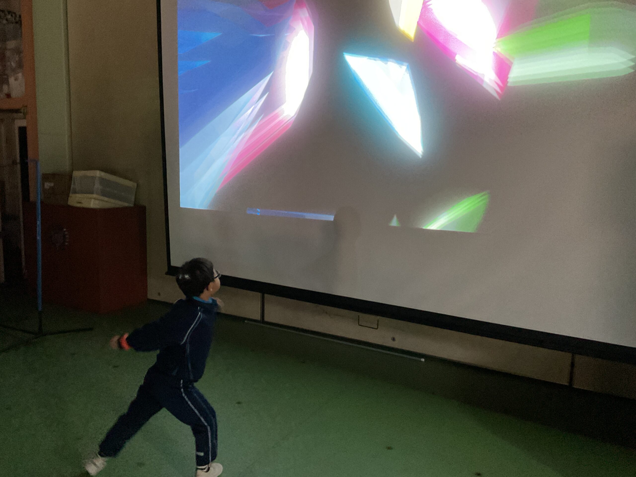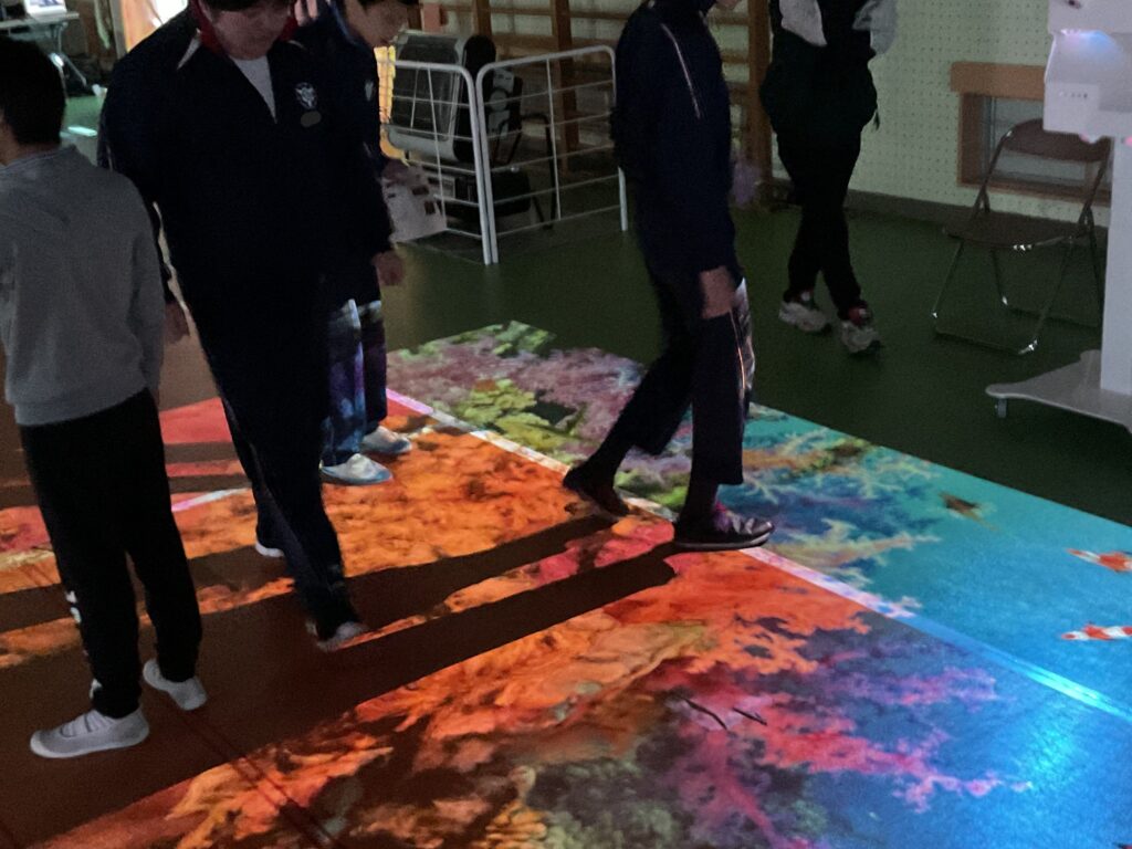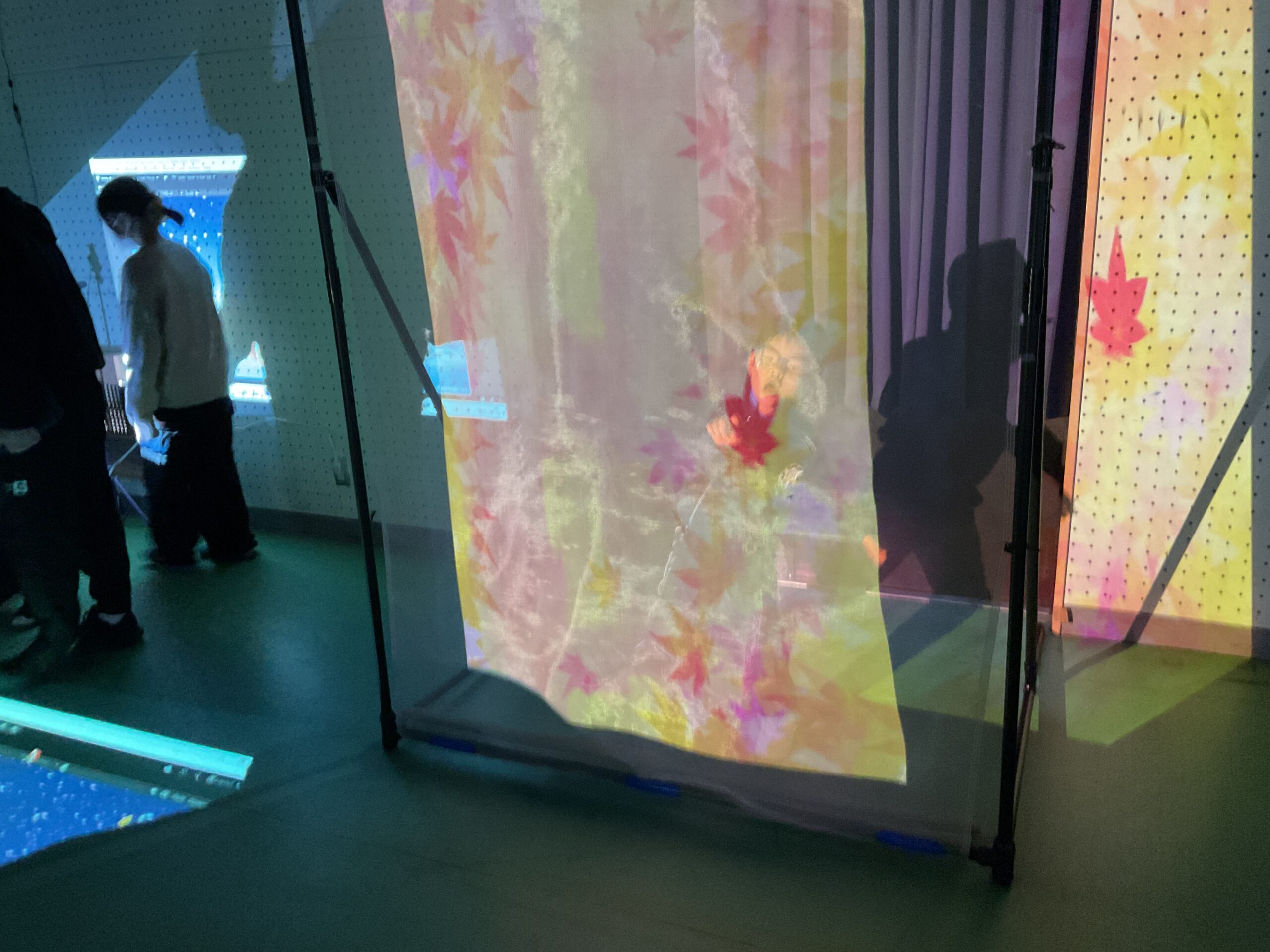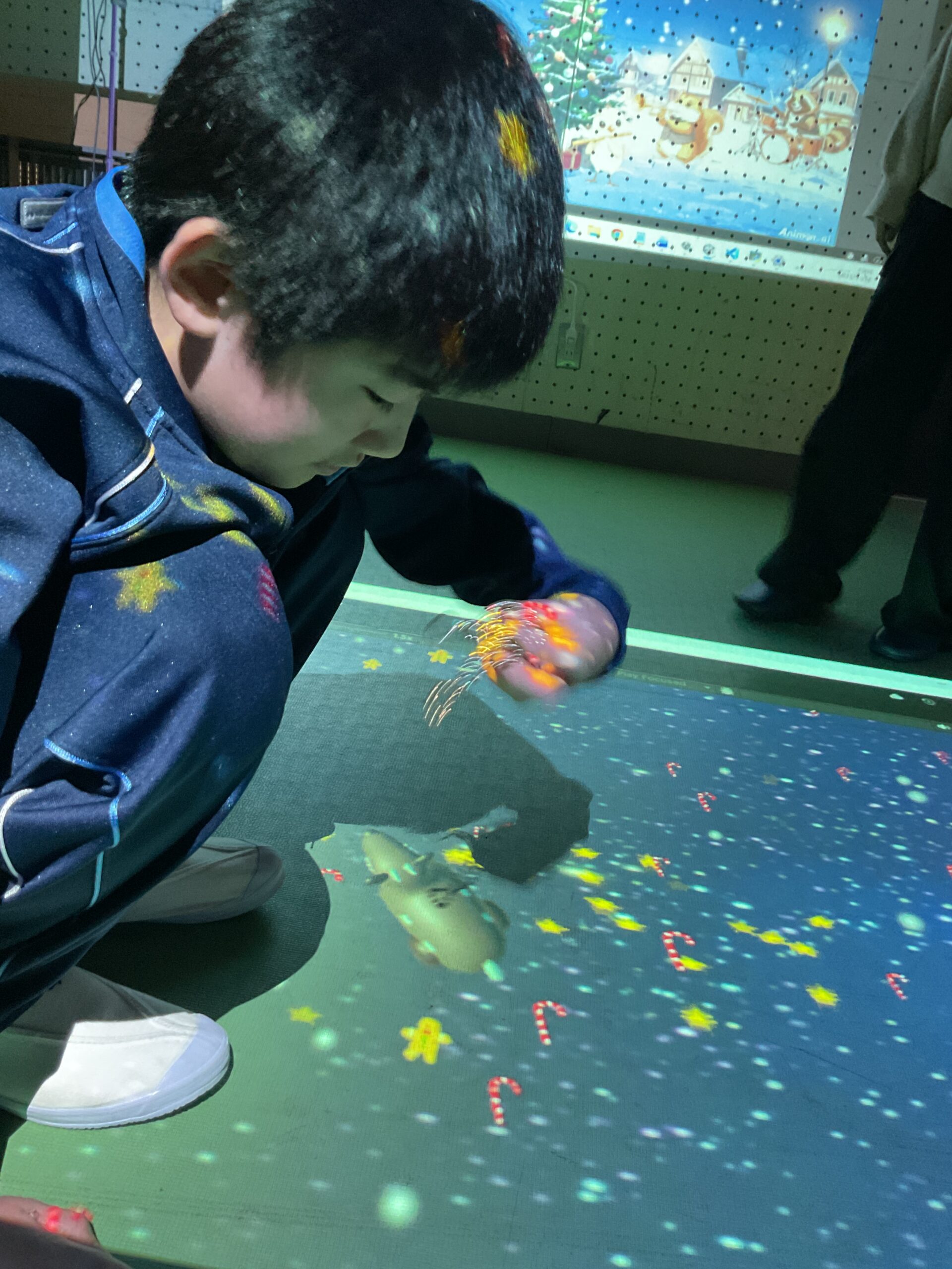 楽器を持った動物のイラストに触れると、その楽器の音が鳴り、紅葉に触れると紅葉が動き、床のトナカイが集まってくるなど、ワクワクする仕掛けがたくさんありました。参加者は全身を使って楽しんでいました。