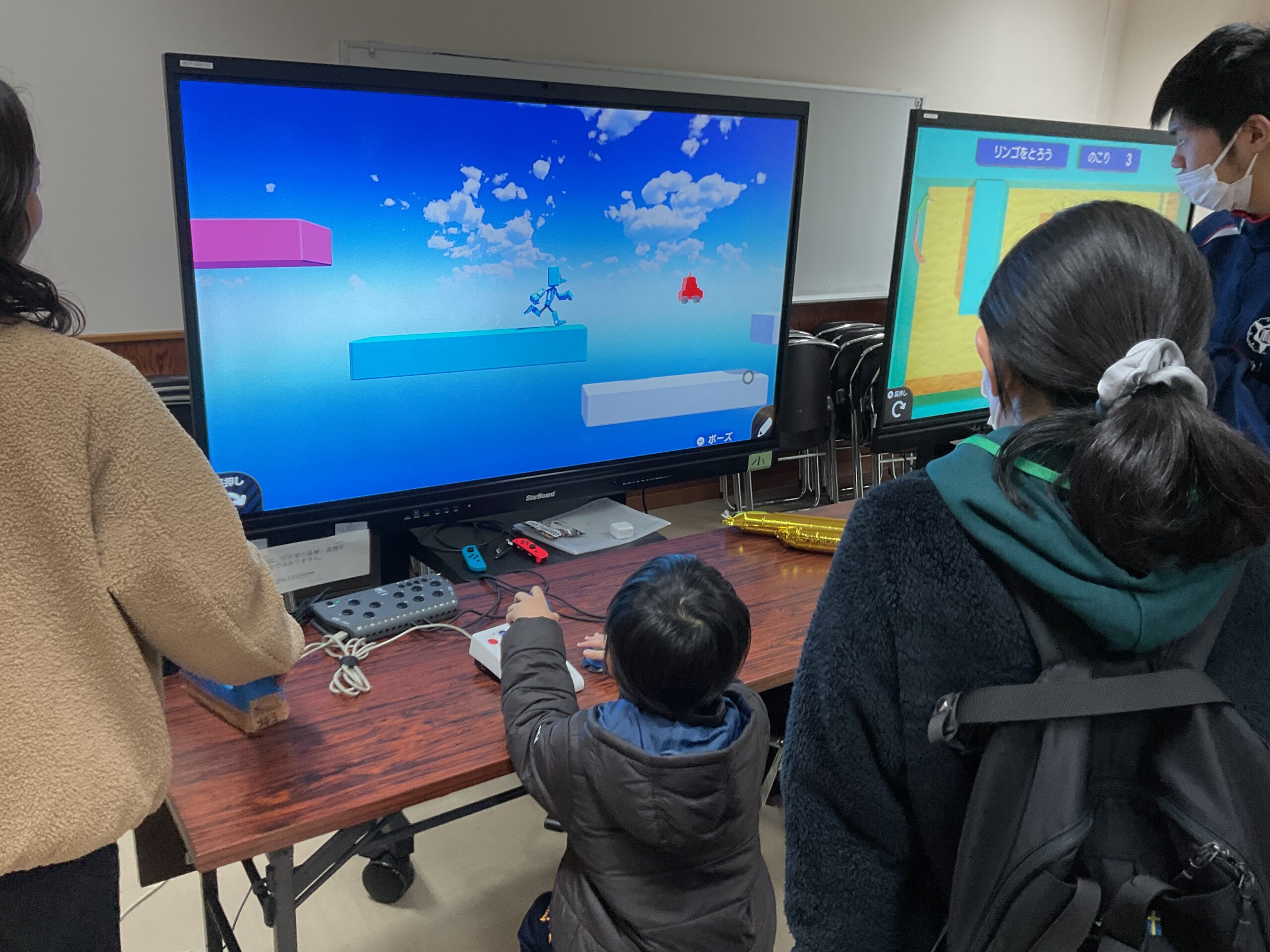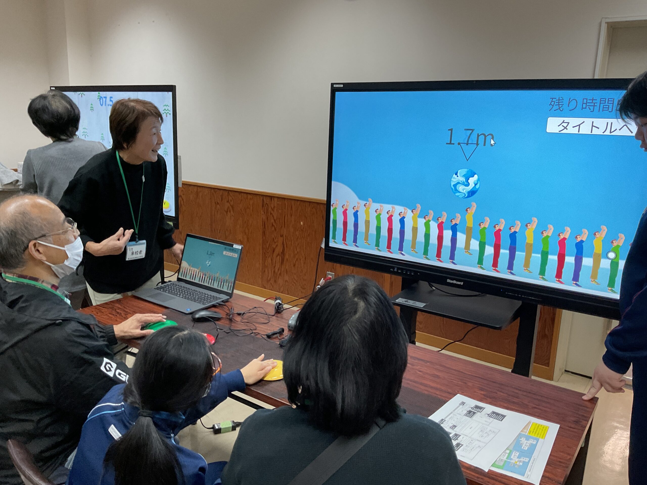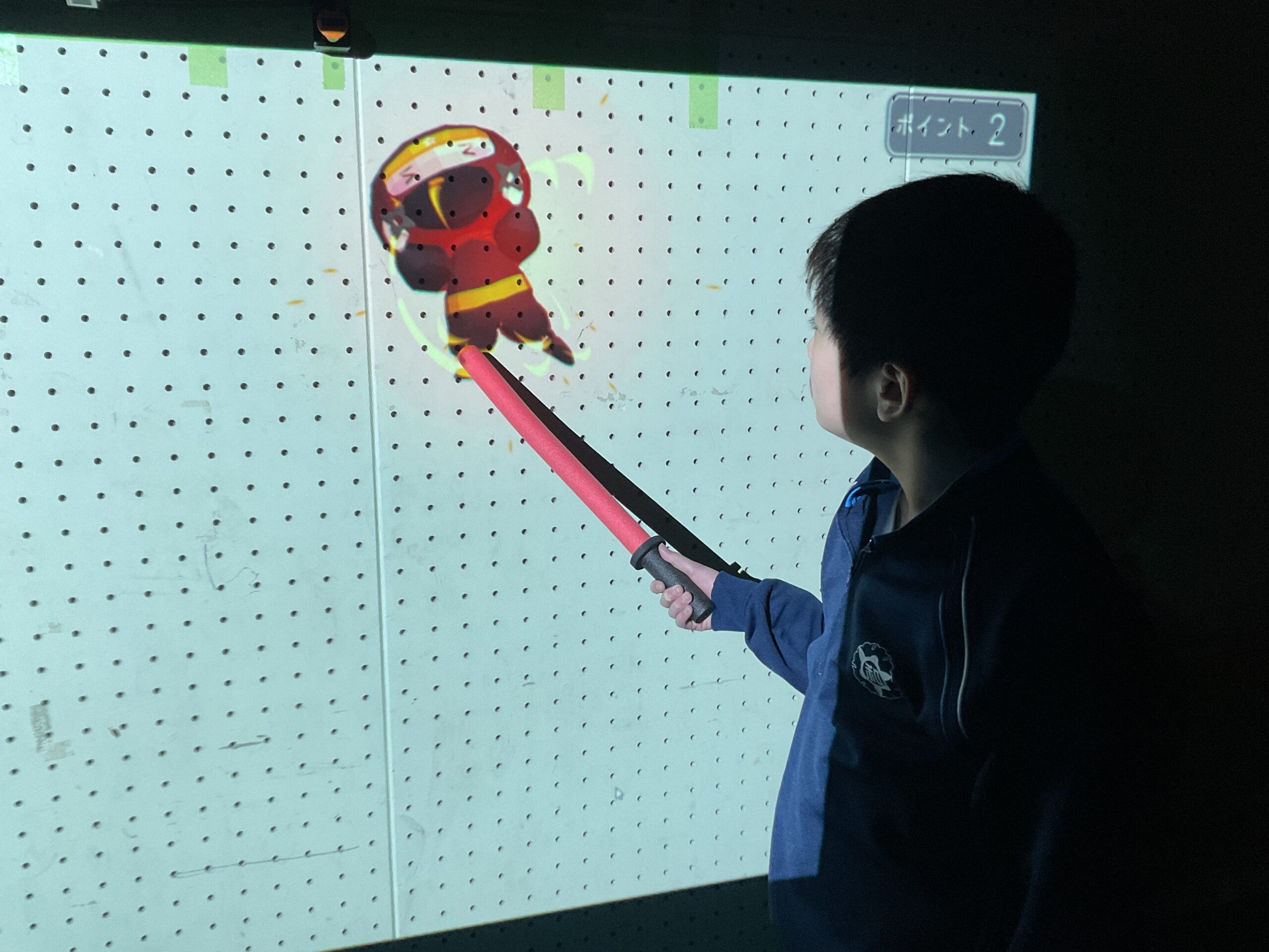 楽器を持った動物のイラストに触れると、その楽器の音が鳴り、紅葉に触れると紅葉が動き、床のトナカイが集まってくるなど、ワクワクする仕掛けがたくさんありました。参加者は全身を使って楽しんでいました。