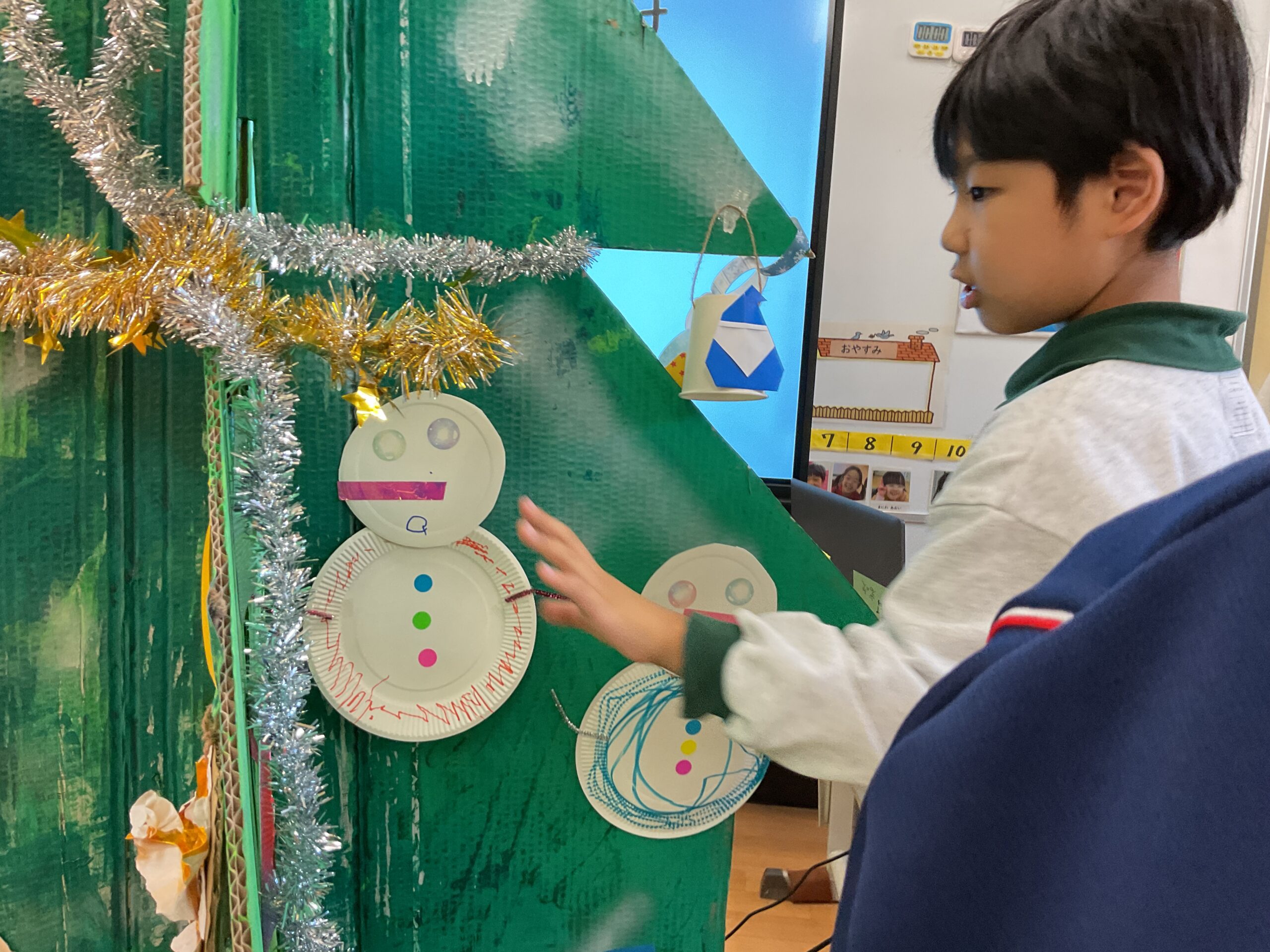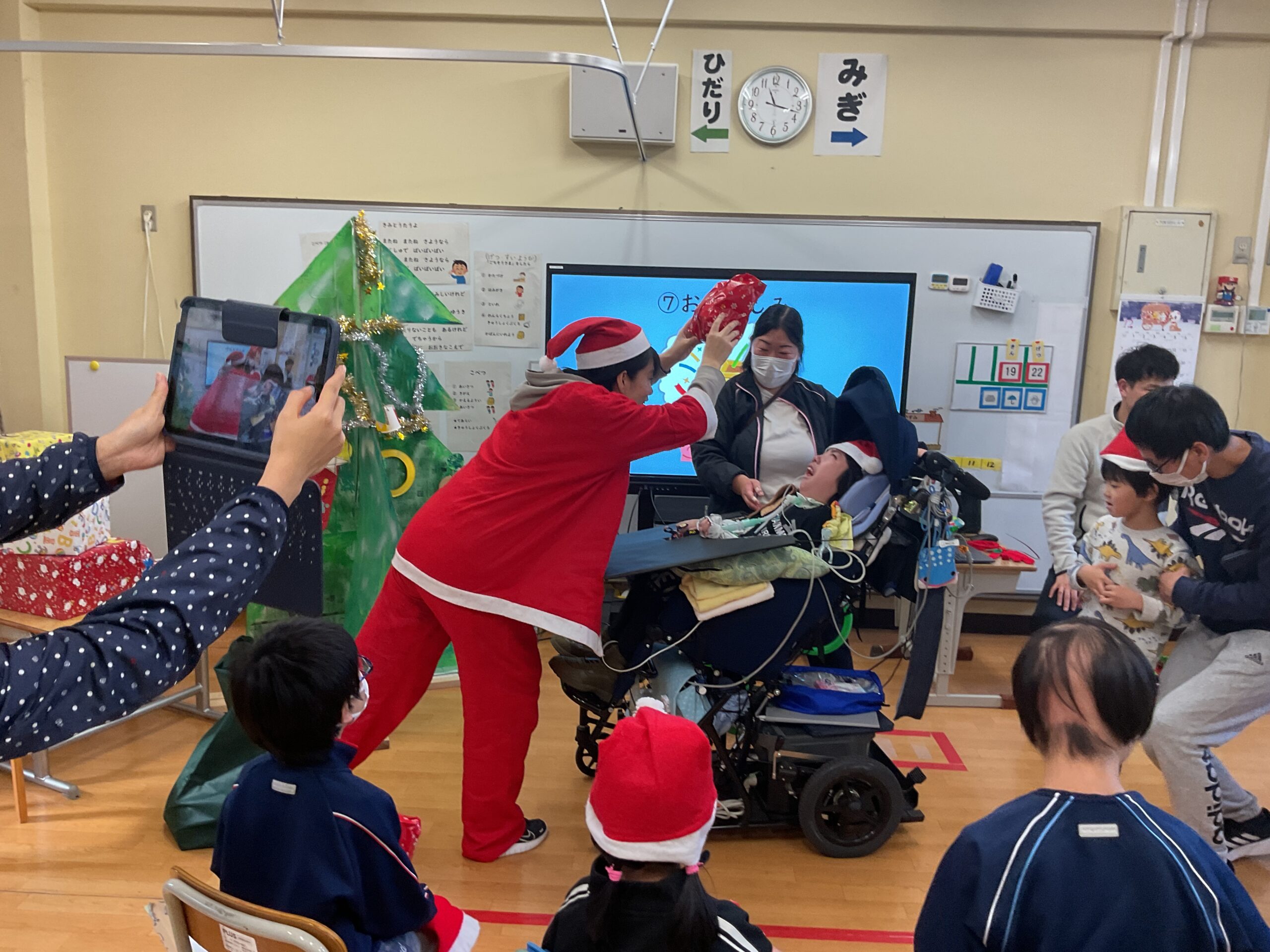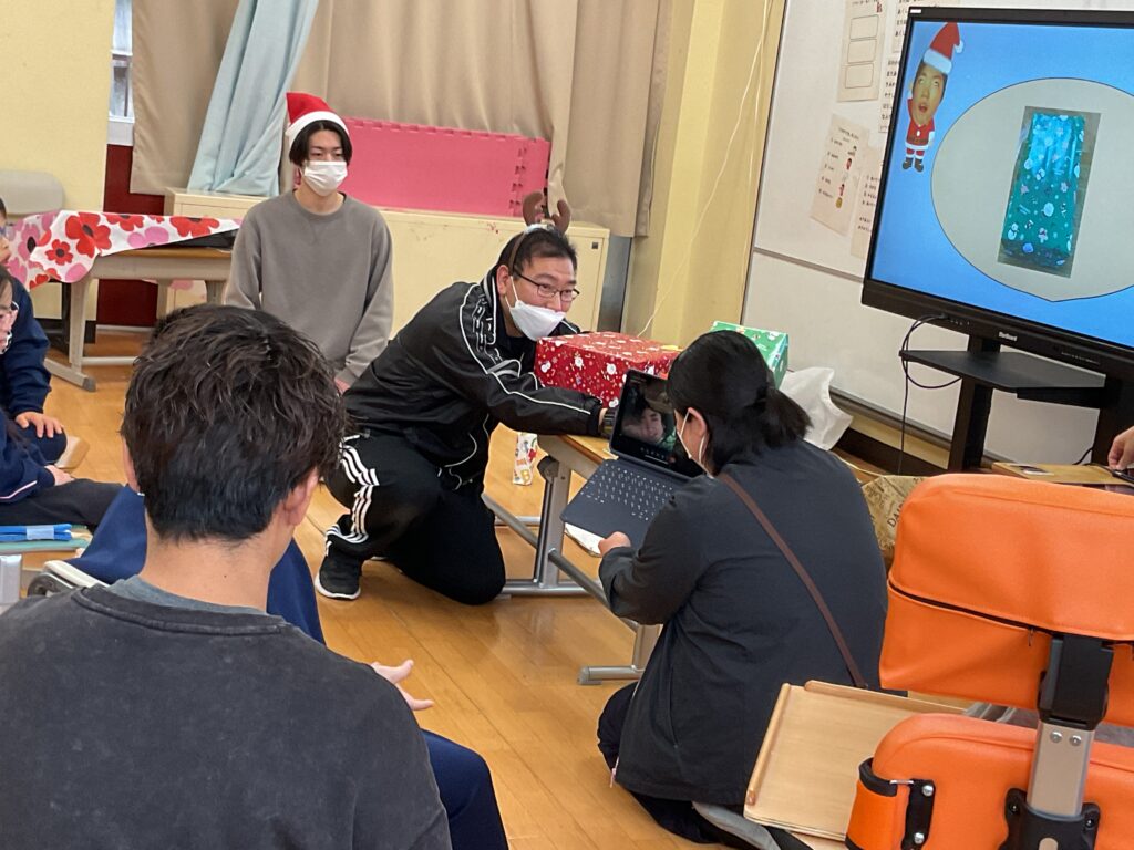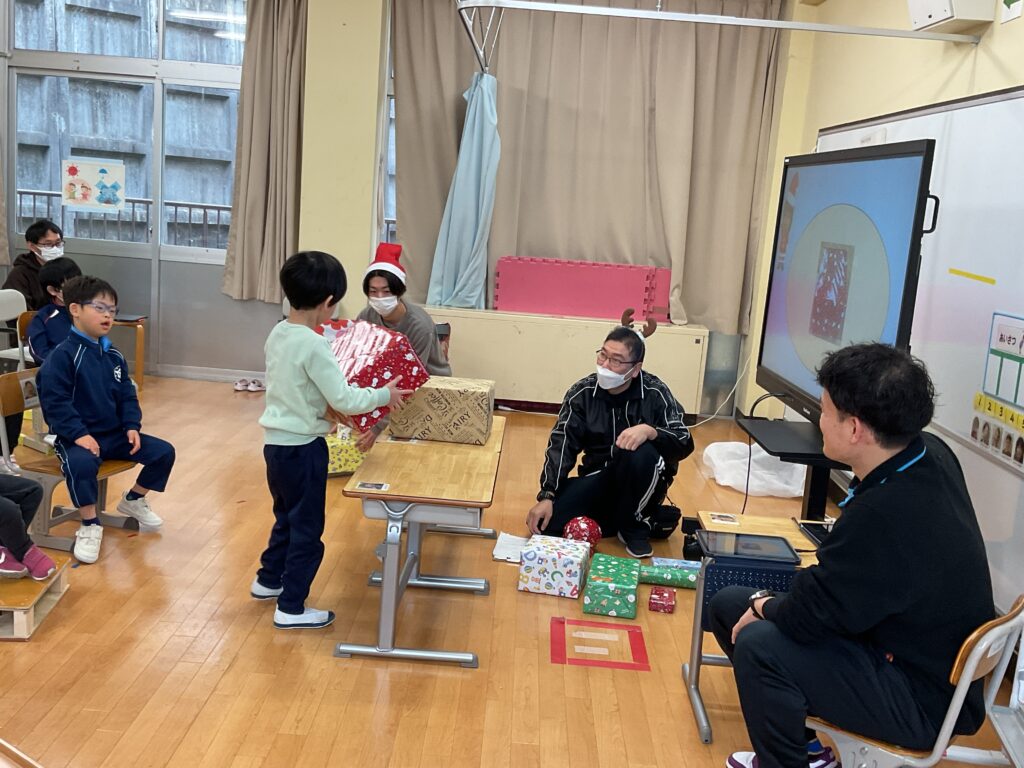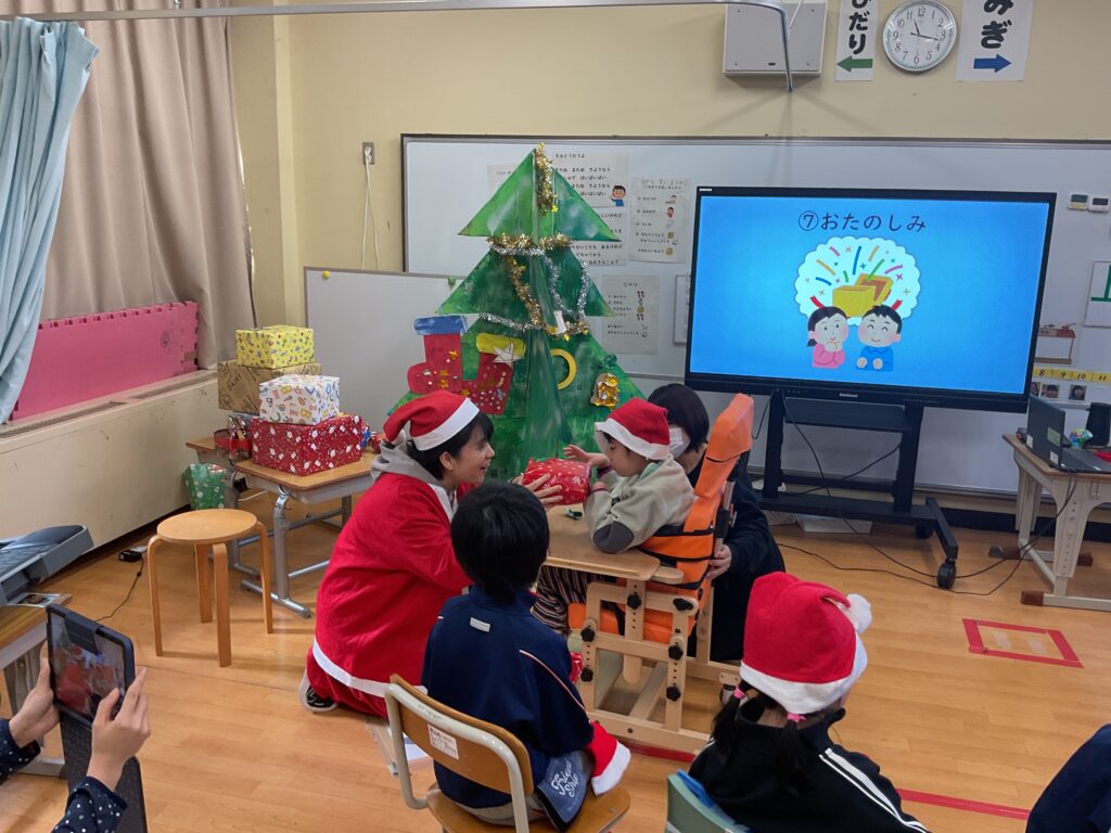 12月19日、小学部でクリスマス会をしました。クリスマスの飾りをつけ、プレゼントゲームをして、楽器を鳴らしながら「あわてんぼうのサンタクロース」を歌いました。プレゼントをもらう時には、きれいに一列に並んで、笑顔で「ありがとう」と伝えることができました。