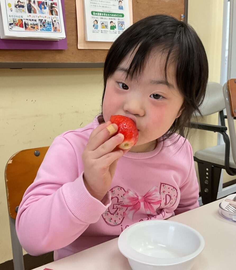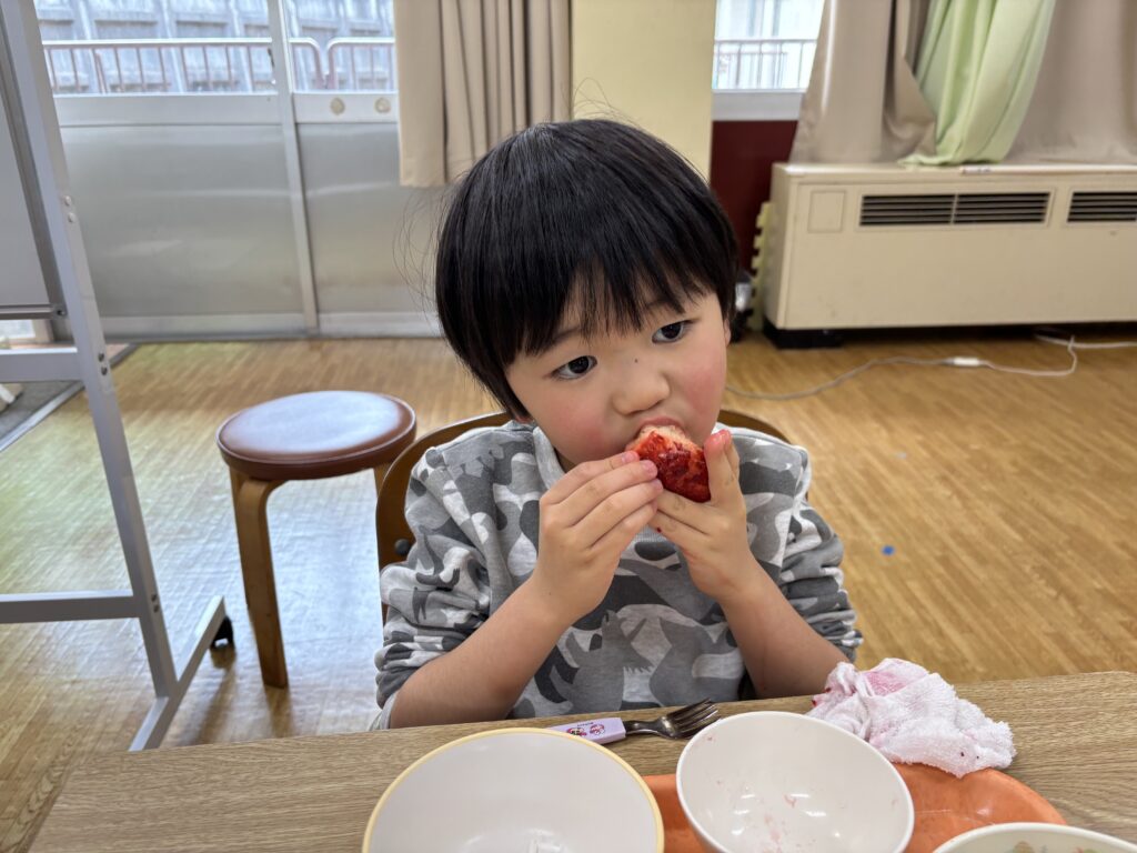 子どもたちはお皿に並べられたいちごを見て「わあ、いちご!」「大きい!」と嬉しそうに声をかけ合っていました。真っ赤に熟したいちごは、ひと口食べると甘さがふわっと広がり、とてもおいしかったです。