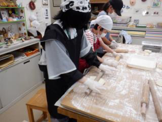 約1時間寝かせたうどんの生地を麺棒で薄くのばし、包丁で切るとうどんになります。