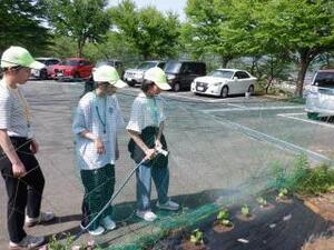 お互いを知ろうの活動では、やまびこ農園の畑でキュウリの苗植えと種まきをしました。
