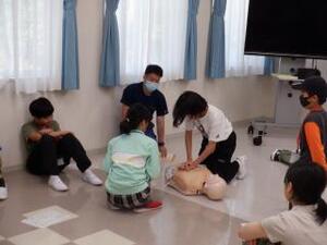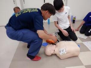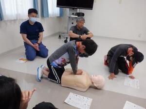 ダミー人形を使って、実際に胸骨圧迫やAEDの通電操作の練習をしました。