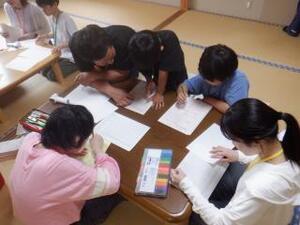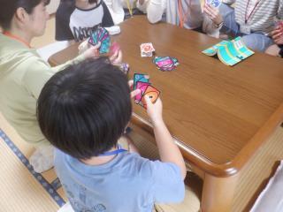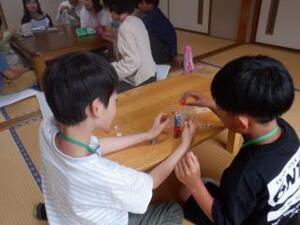 お互いを知ろうの活動では、あいにく天候が悪いため、語らいの部屋でカードゲームやサイコロ積みをしました。