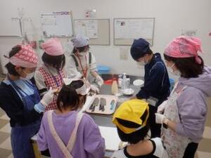 サラダ担当は屋内での調理。さつまいもを丁寧に蒸し、玉ねぎとベーコンを手際よくカット。