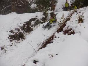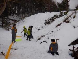 そりで斜面を走り抜ける子、雪の中に飛び込む子、それぞれ活動します。