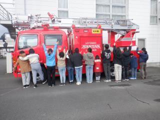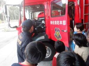 はしご車、レスキュー車、ポンプ車等について、実際に使う物を持ったり、座席を見せていただいたりしました。