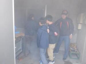 1つ目は、真っ暗な建物の中に煙が充満した状態での避難です。