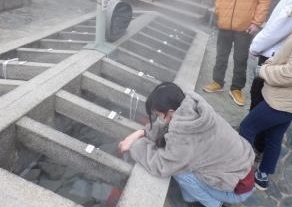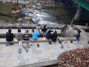 昼食は川沿いにある足湯の近くで食べます。
