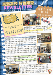 特色類型NEWSLETTER第15号 2025年12月22日50回生、51回生、特色類型、特色類型推進部teachers 特色類型NEWSLETTER第15号を掲載しました。今回は10月28日(火)と11月4日(火)にそれぞれパーソナルジムSTYLEの吉田先生、京都光華女子大学の河嶋教授に行っていただきました健康スポーツ類型2年生・3年生の学校設定科目「アスレチックパフォーマンスⅠ・Ⅱ」の出前授業の様子についてです。画像をクリックしてPDFファイルをご覧ください。