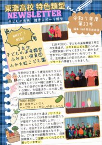 特色類型NEWSLETTER第23号 2026年2月3日50回生、特色類型、特色類型推進部admin 特色類型NEWSLETTER第23号を掲載しました。 今回は11月に3年生の子どもの未来類型が行った、ふかえ虹こども園でのふれあい保育についてです。 画像をクリックしてPDFファイルをご覧ください。