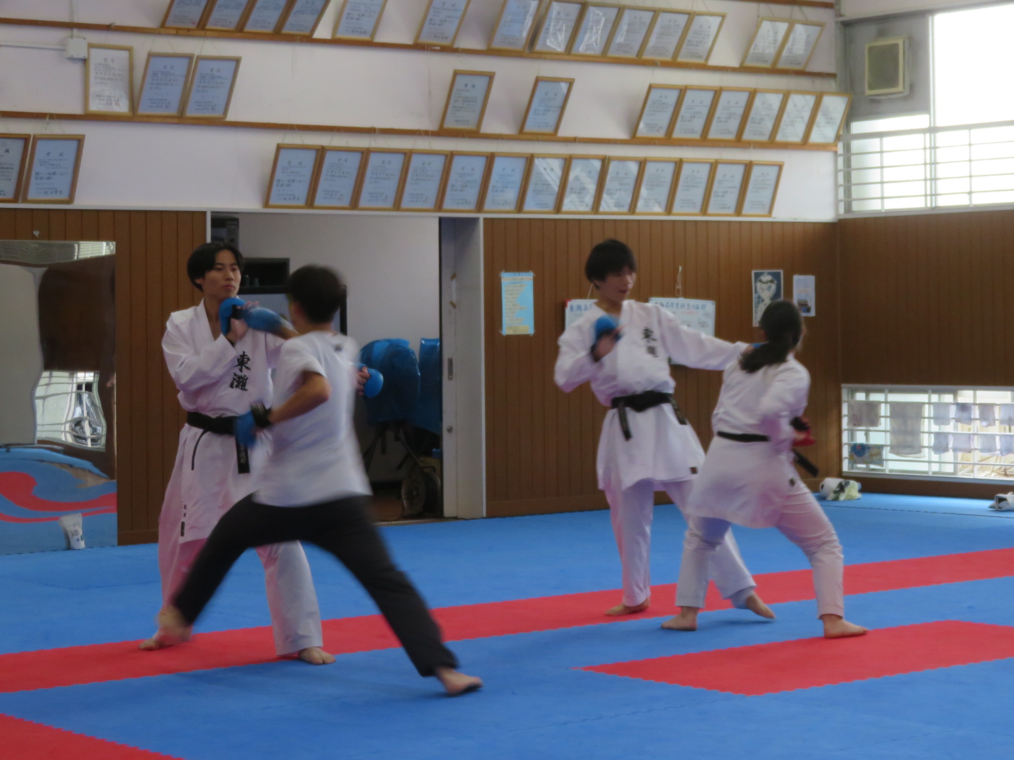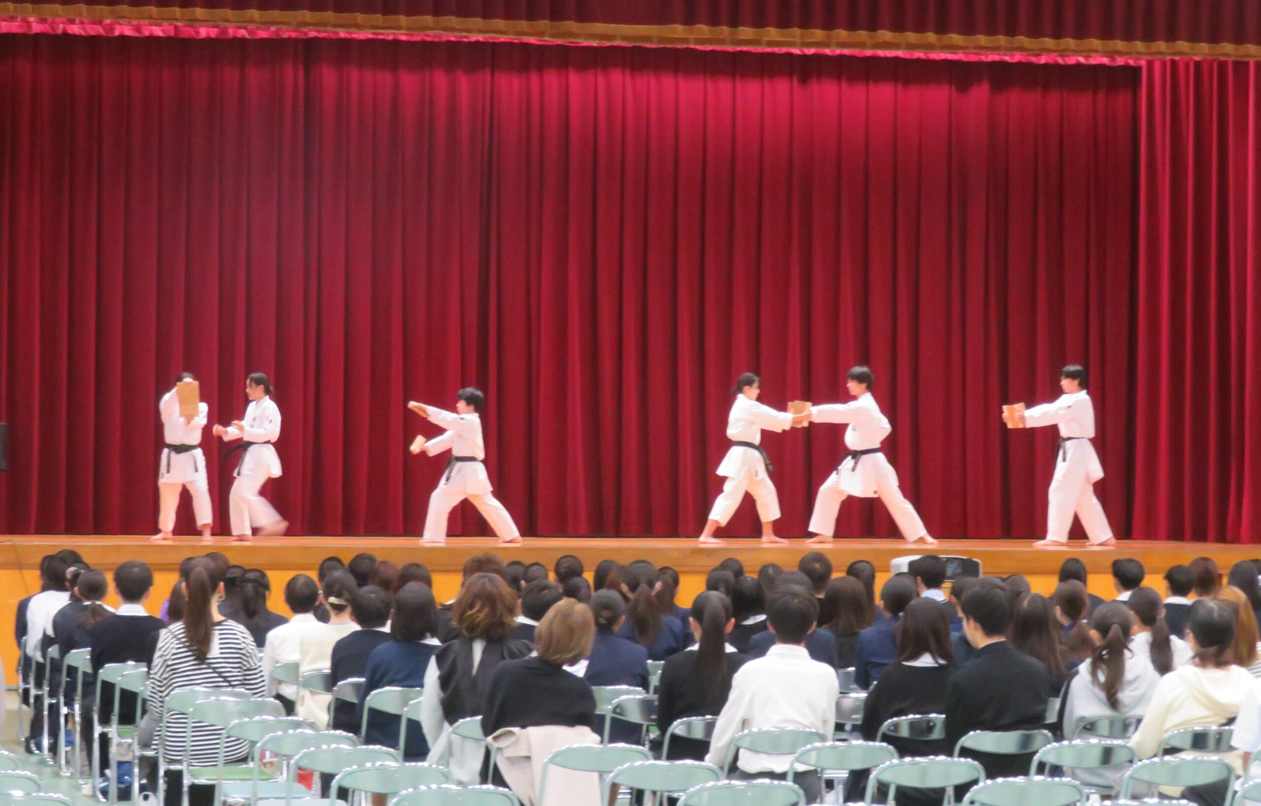 空手道部の演舞披露からのスタートです。学校紹介は生徒が主体となって行いました。